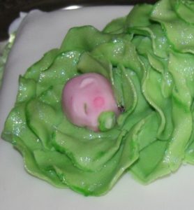 Siskon valmistujaisiin tehty tradenomilakki. Nauha tehtiin kiertämällä kahta ohutta sokerimassapötköä toistensa ympäri ja tupsuun saatiin enemmän eloa leikkaamalla sitä saksilla.