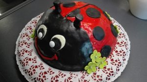 Siskon pojan syntymäpäiville tuli tehtyä leppäkerttukakku. Vaikka kakku hiukan epäonnistui, täytyy se julkaista täällä, jotta voi jatkossa muistaa muutamia tärkeitä asioita sokerimassakakuista 🙂